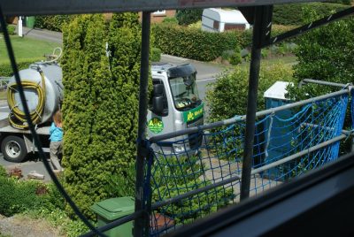 …… arbeiten. Ich freue mich immer über Kleinigkeiten: Nach 14 Tagen wurde endlich das Baustellenklo „gewartet“ – in klassischer Rollenaufteilung: sie arbeitet und er sitzt