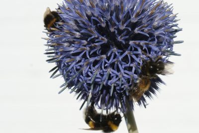 Kugeldistel mit Besuch. Der Juli war ja nur zur Hälfte ein Sommermonat und der August tut sich ebenfalls schwer: entweder kalt oder schwül-gewittrig! Hauptsache genug Regen, dann ist die Kugeldistel für die Wildbienen eine verlässliche Nahrungsquelle und sie gedeihen im Garten ausgesprochen gut.