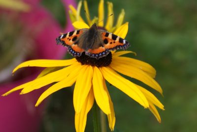 Der kleine Fuchs besucht eine Rudbeckia-Blüte. Das Foto entstand zwar Ende August, aber dank des schönen Spätsommerwetters fliegt der kleine Fuchs auch noch im September. Die Kinderstube seiner Raupen ist übrigens die hohe Brennnessel.