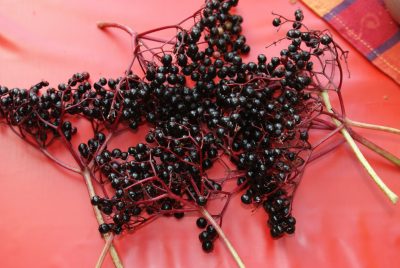 September 2019die erste Ernte in dieser Saison – gegen den zeitweise blauen Himmel sehen die schwarzen Beeren gar nicht nach Herbst aus