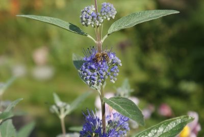 Die Bartblume Heavenly Blue (Caryopteris) in voller Blüteund mit Bienenbesuch. Die Bartblumen stammen aus China und der Mongolei. Die Sorten heavenly blue und der blaue Spatz sind angeblich winterhart. Aber ein Blauer Spatz ist mir hier im Norden schon eingegangen. Deshalb kommt heavenly blue im Topf ins Winterquartier.