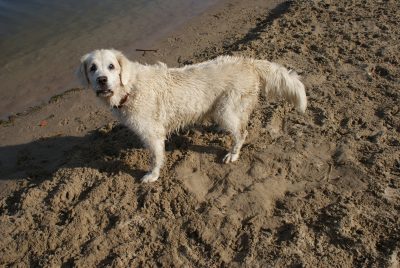 Diese Äpfel hat Ella immer aufgeknackt, damit die anderen Hunde es leichter haben beim Fressen. Das brachte ihr den Namen „Applecracker-Ella“ ein. Nun ist auch Ella von uns gegangen. Diese fröhliche durch und durch gutmütige Hündin war von ihren Erstbesitzern nicht geimpft worden und hatte sich deshalb mit Leptospirose (dem Tod aus der Waldpfütze) infiziert. Zu allem Übel wurde sie – natürlich – nicht gegen die Leptospiren behandelt, obwohl es ein spezielles Antibiotikum gibt. Und so nahm das Unheil seinen Lauf. Zuerst werden die Nieren angegriffen und dann der restliche Stoffwechsel zerstört. 5 Monate hat sie Nierendiät (royal canin renal) gefressen und eine Woche vor ihrem Tod fing sie an, die Diät zu verweigern. Sie fraß nur noch wenig Ausgewähltes (z.B. Lammstängchen), sonst eigentlich nichts mehr …..Hier kommt die „Atlantikschwimmerin“ Ella gerade vom Baden im Baggersee zurück. Für sie gab es eigentlich nur 2 Plätze, wo es sich lohnte hinzulaufen: ne Wiese zum Wälzen und der Baggersee zum Schwimmen. Und so blind wie sie war, sie wollte immer alleine aus dem Auto springen. Einsteigen machte sie selbstverständlich auch alleine – wie sie die Abstände bemaß, weiß kein Mensch.