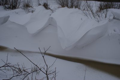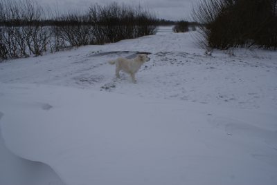 der Schnee wird vom Oststurm über den Graben gefegt, einige Stunden später ist der Graben bereits voll und die Schneewehen erreichen fast 80 cm Höhe. Seit Sonntagnacht schneit es etwas (Lake Effect oder auch Ostseeschnee) und der Sturm treibt den Schnee in hohen Wolken über’s LandDa fliegen die Hundeohren ……